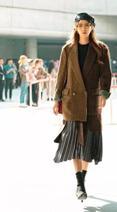 西装外套当然也是不能少得了,这次的小姐姐是选择了一件棕色的千鸟格西装外套,里面则是搭配了一件黑色的打底衫,下面则是搭配了银色的百褶半身裙,褶皱的元素可以让造型起到更好的遮肉的效果,而且几种颜色搭配在一起,也让造型更时尚不少了。