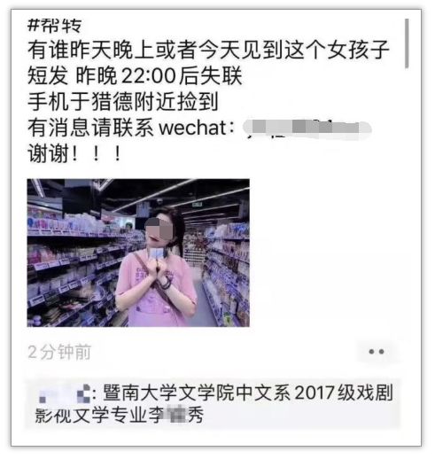 10月22日22时左右,暨南大学文学院中文系2017级戏剧影视文学专业学生李某秀在离开校园后失联。其同学表示,李某秀在离开校园时曾在微信上联系舍友帮忙留门,但彻夜未归。学校老师在今日上午接到警方电话,称李某秀的手机和鞋子于珠江边被环卫工人拾得。