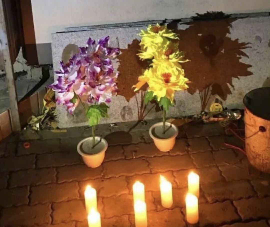 小琪的家属在此摆满了鲜花蜡烛
