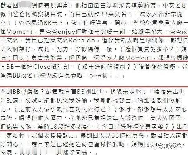 这次奚梦瑶产子作为父亲的何猷君并没有亲自给儿子剪脐带,而是为了能让儿子和赌王四太关系更亲密一些,所以就让妈妈代替自己剪脐带。而成功升级奶奶的赌王四太接受采访的时候也是难掩兴奋的心情称:“好突然,好开心又兴奋,我自称自己叫“妈婆豆腐”,因为何超盈产女自己又是做奶奶又做姥姥。