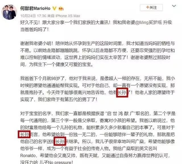 何猷君1995年出生,今年24岁,他难掩喜悦发长文,但因文中多次强调“长孙”惹来争议。