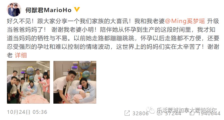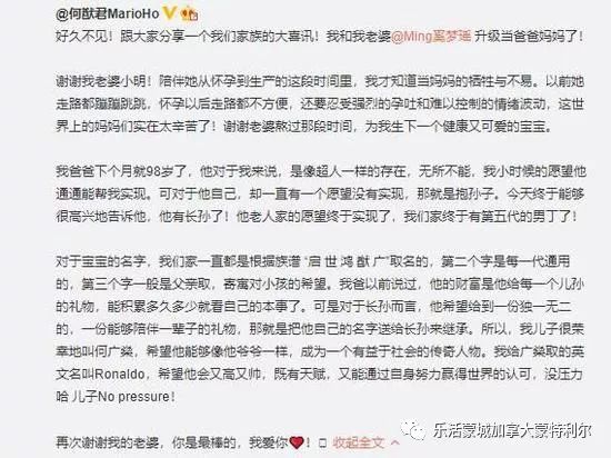 10月25日,赌王四太的儿子何猷君对外分享重大喜讯,妻子奚梦瑶诞下一子,取名何广燊,英文名叫Ronaldo。