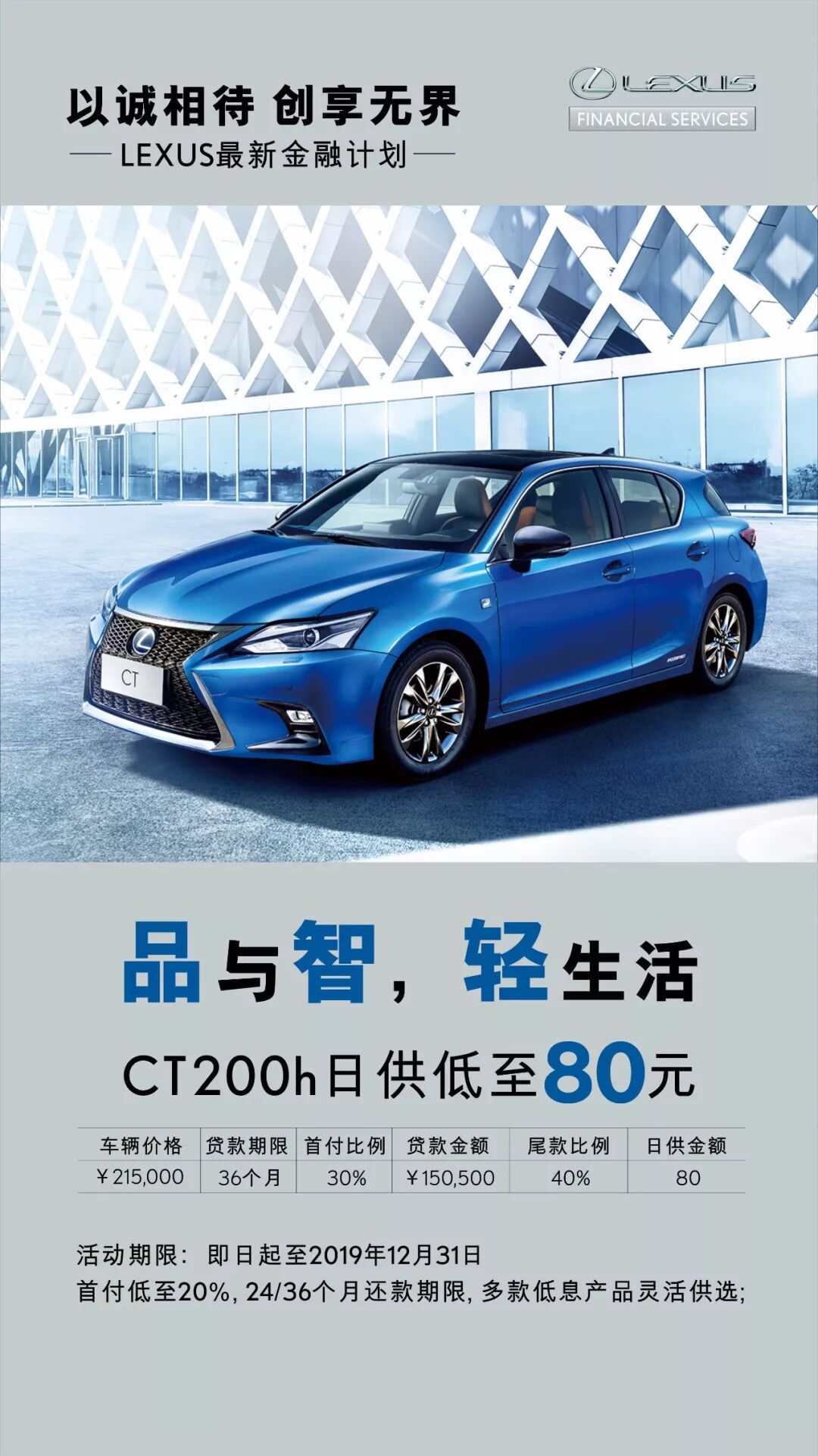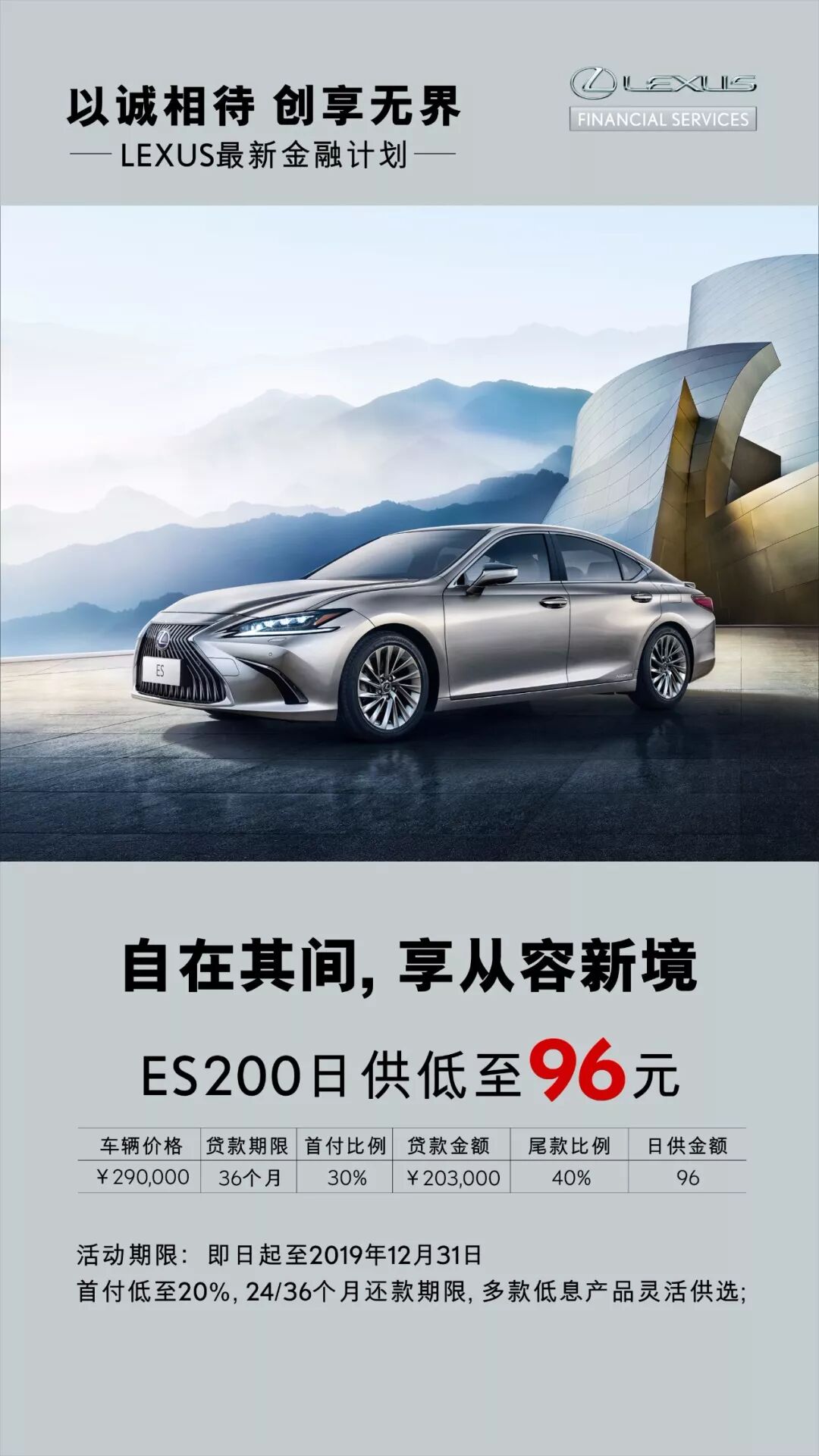 2019年10月1日至2019年12月31日,雷克萨斯中国通过雷克萨斯金融等渠道,针对旗下豪华座驾ES、NX、UX、LS、CT等车型推出轻松融资233、轻松融资334、低首付低利息等金融优惠政策,供您选择。
