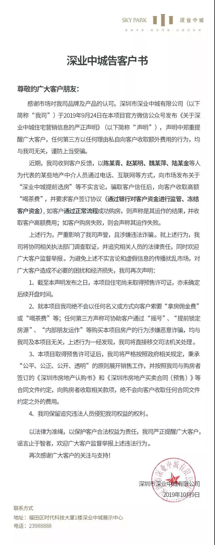 10月9日,深业中城发布告客户书,绝不会以任何名义或方式向客户索要“拿房佣金费”、或“喝茶费”等。