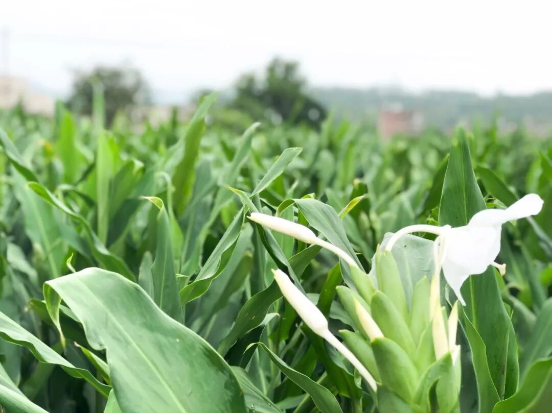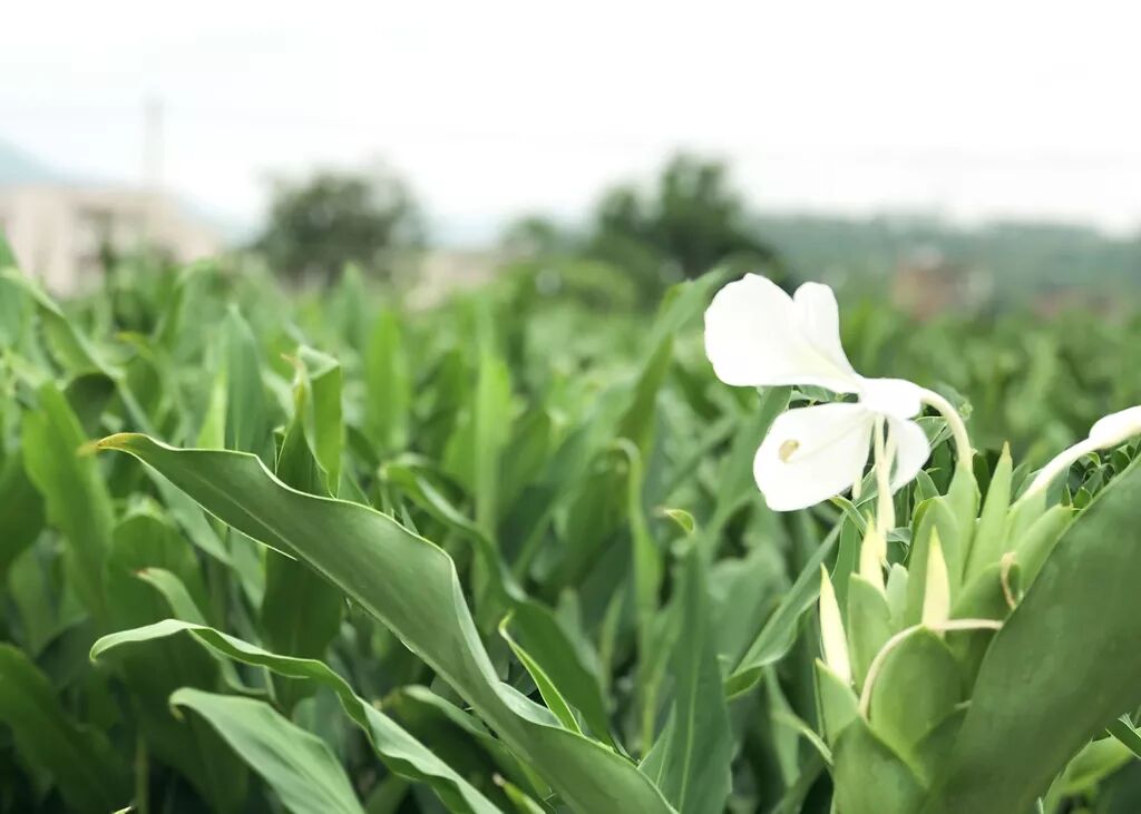 在云罗村的姜花种植基地,地里的姜花一片翠绿,部分已经开放,白色的花蕾点缀了绿油油的花田,空气中飘着淡淡的花香。