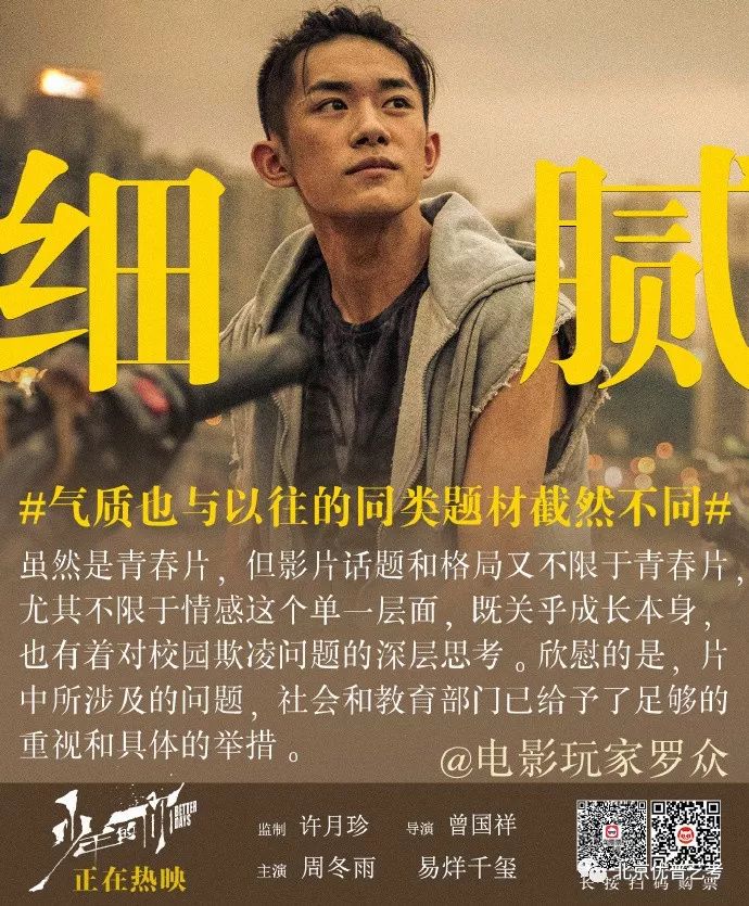 但是相较之下,大陆电影这一题材比较罕见。《少年的你》的首要意义是,它较之于之前关注校园欺凌的电影《悲伤逆流成河》更进一步,更全面、更深入也更尖锐地聚焦了校园欺凌。