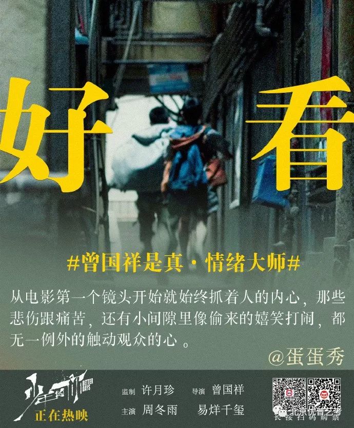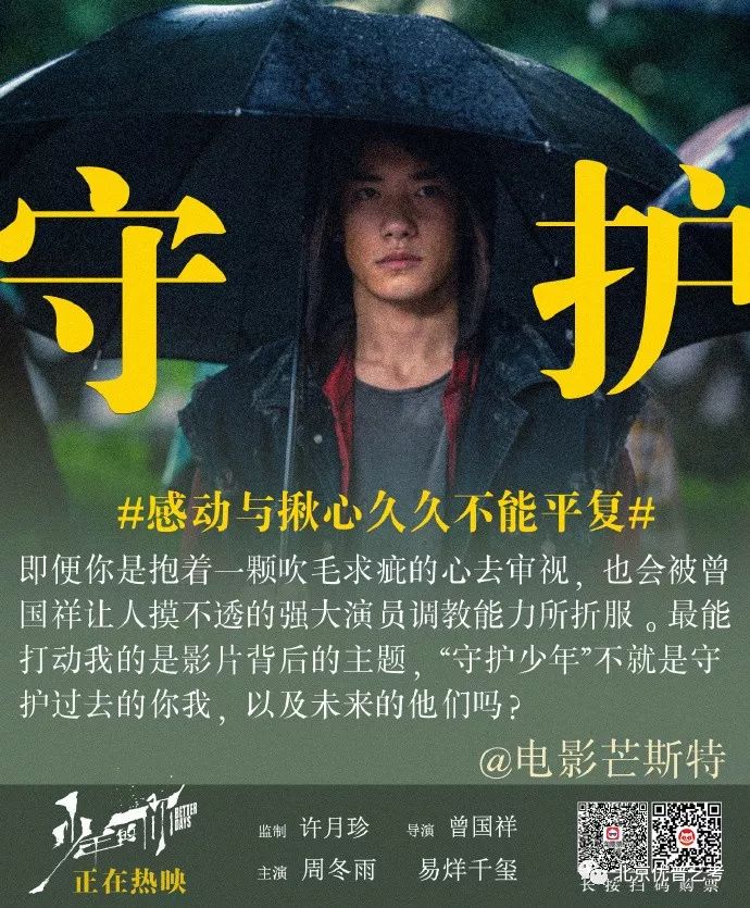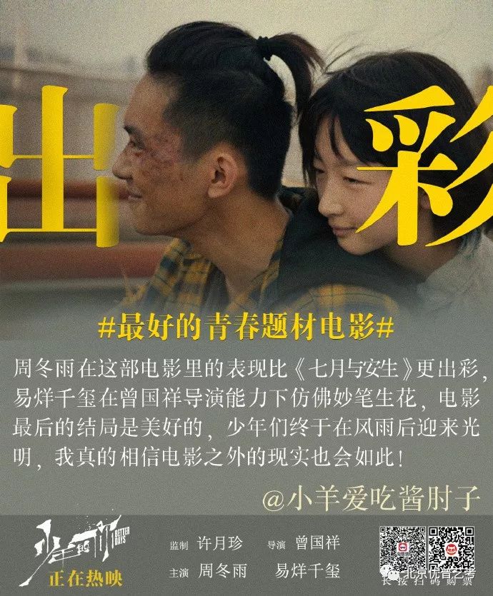 说《少年的你》自带光环一点也不为过,《七月与安生》原班团队——导演曾国祥、监制许月珍、摄影余静萍,再加上流量巨擘易烊千玺的银幕首秀,最后加持金马影后周冬雨,这个阵容就真的值得一看。