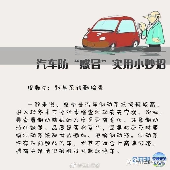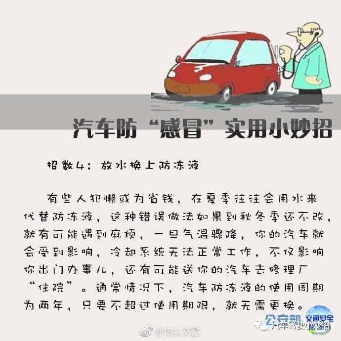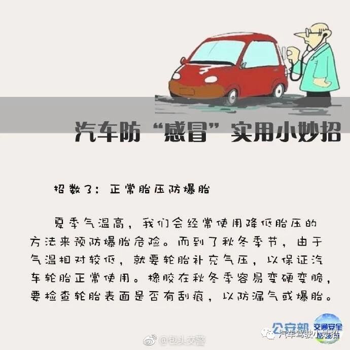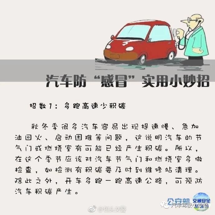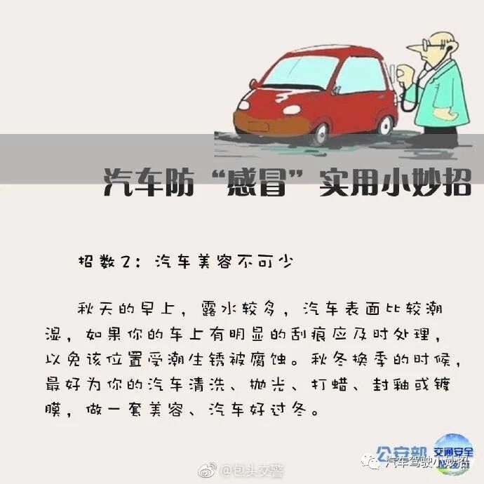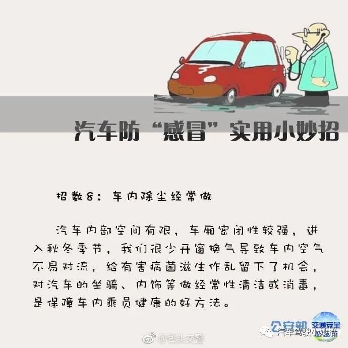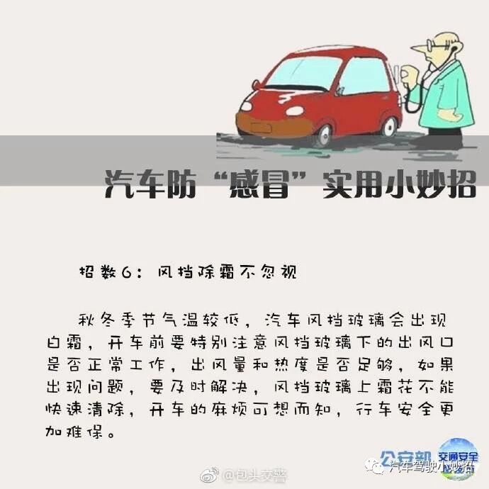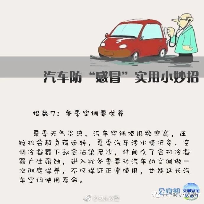 【汽车防感冒 实用小妙招】秋冬季节是感冒高发季,开车坐车的人如此,我们的汽车在这个季节也容易“感冒”,怎样预防汽车“感冒”呢?给您八个小妙招.