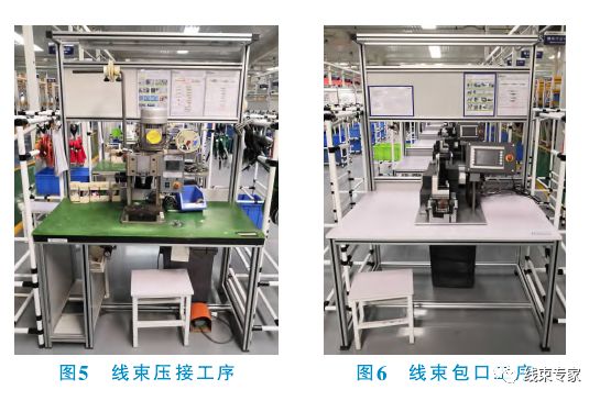 线束加工过程中,可针对特殊特性的线束产品设计,选用铝型材设计制造的配套工装架。目前主要用于线束加工工序中的线束压接工序如图5所示,针对线束加工过程中的导线压接工序,压接机自身质量大,并且频繁震动,选用铝型材设计有针对性的工装架,既可满足压接机大质量的承载问题,又能解决压接机在工作时的频繁震动。线束包口工序如图6所示,针对线束加工过程中的打卡线包口工序,包口机自身质量大,电气回路需要在工装架上排布,选用铝型材就可有效满足自身承重和电气回路在铝型材内部排布走线问题。线束检测工序如图7所示,由于检测工序工装架形式单一,固化效果明显,选用铝型材设计线束检测工序的工装架,方便电气回路走线的同时,又能满足检测工序位置的固化。