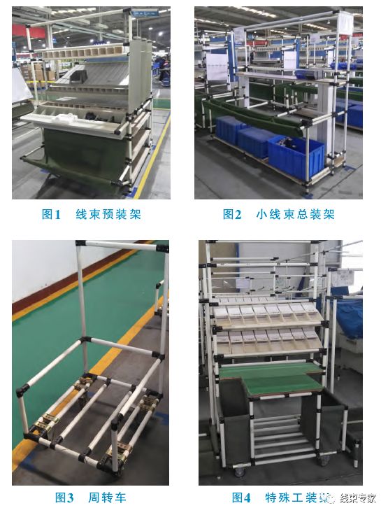 线束配套线总装工序如图2所示,此类工装架在设计初期就需要考虑到线束配套线线种简单、材料简单、对场地要求单一,我们在选用精益管设计配套线总装架时,就可以充分考虑此类工装架的共用性,单一配套线总装架可生产不用型号线束的配套线。线束周转工序如图3所示,针对线束加工流程的频繁周转特性,采用精益管设计的周转架,可有效满足线束加工各个工序不同需求的问题,如成品线周转工序,选用精益管设计,在最大限度地满足周转能力的同时,又能随着包装箱规格的变化而更改完善周转架。