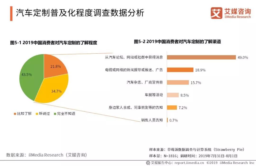 iiMedia Research(艾媒咨询)数据显示,网民对汽车定制的了解程度不高,比较了解的只占21.8%,完全不了解的占43.5%,在了解的56.5%的人当中,将近一半(49.0%)从汽车论坛、网站或社群中获得消息,其次是相关推送和汽车杂志、宣传册。艾媒咨询分析师认为,对汽车定制了解得较深的人大多是汽车爱好者,长期浸淫在汽车相关圈子中,由此可见汽车定制的普及化程度一般。