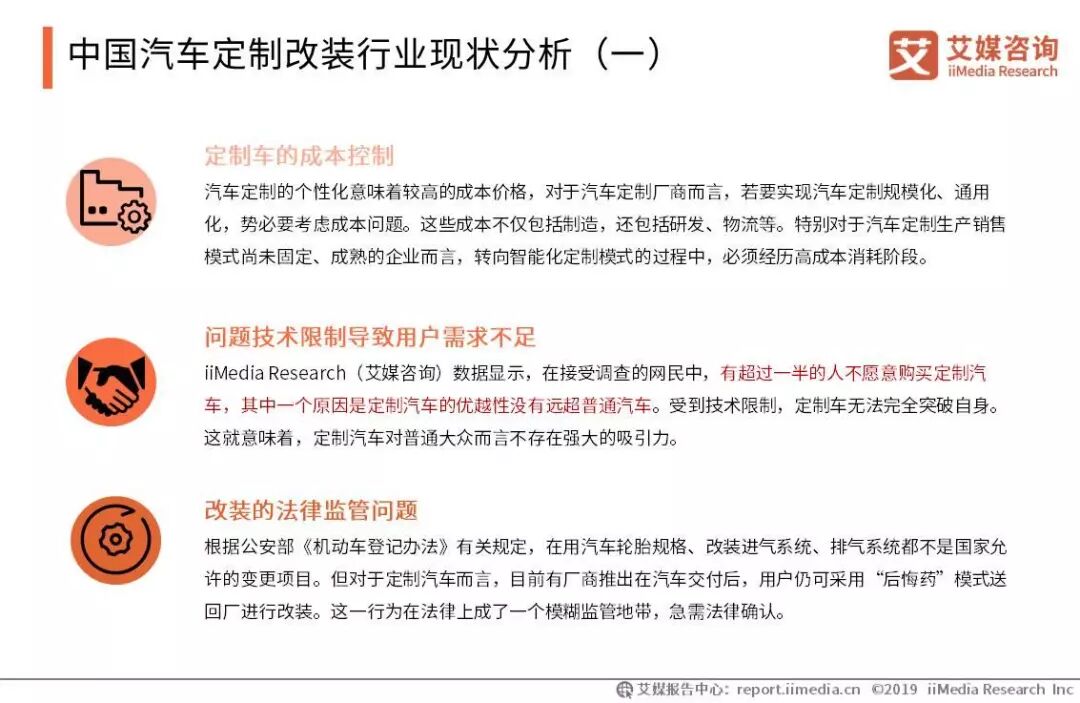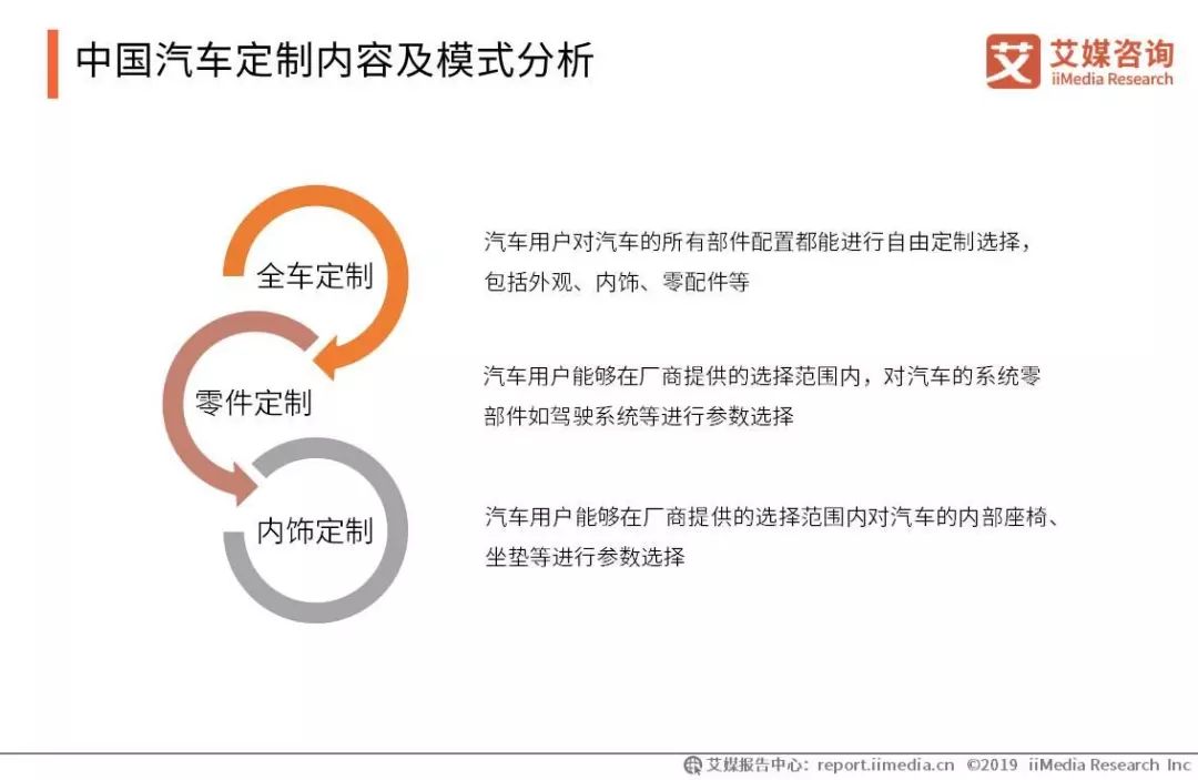 目前中国正处在汽车定制产业的起步发展阶段,能够基本满足消费者的浅层定制,即对车身部分参数进行选择,而对汽车定制规模化生产程度不高,有待进一步发展。艾媒咨询分析师认为,受厂商限制,定制内容集中在外观内饰和装备配置,基础系统部分可选项较少,用户尚无法实现完成自由定制,但是汽车定制改装逐渐成为用户的重要需求,汽车定制改装是汽车企业转型升级的主要发展路径之一。随着消费水平的提高、技术的进步和成本价格的下降,未来汽车改装行业将走向分散化生产,以满足用户完全自由定制需求。