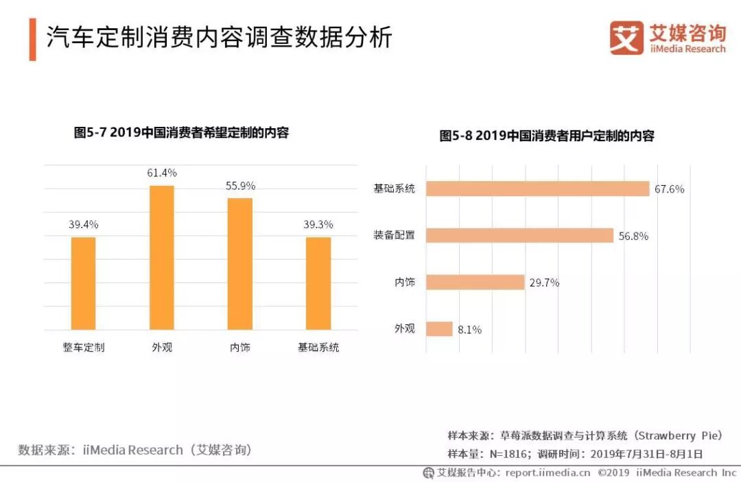 iiMedia Research(艾媒咨询)数据显示,网民愿意定制的内容主要集中在外观和内饰,分别占比61.4%和55.9%,但实际购车用户的定制选择多集中在基础系统和装备配置,各占67.6%和56.8%。但是,也有39.4%的网民想要进行全车定制。艾媒咨询分析师认为,用户愿意定制的内容和实际定制的内容之间存在出入可能是受到对定制汽车了解程度的影响,但对定制汽车厂商而言,全车定制是未来市场的发展趋势。