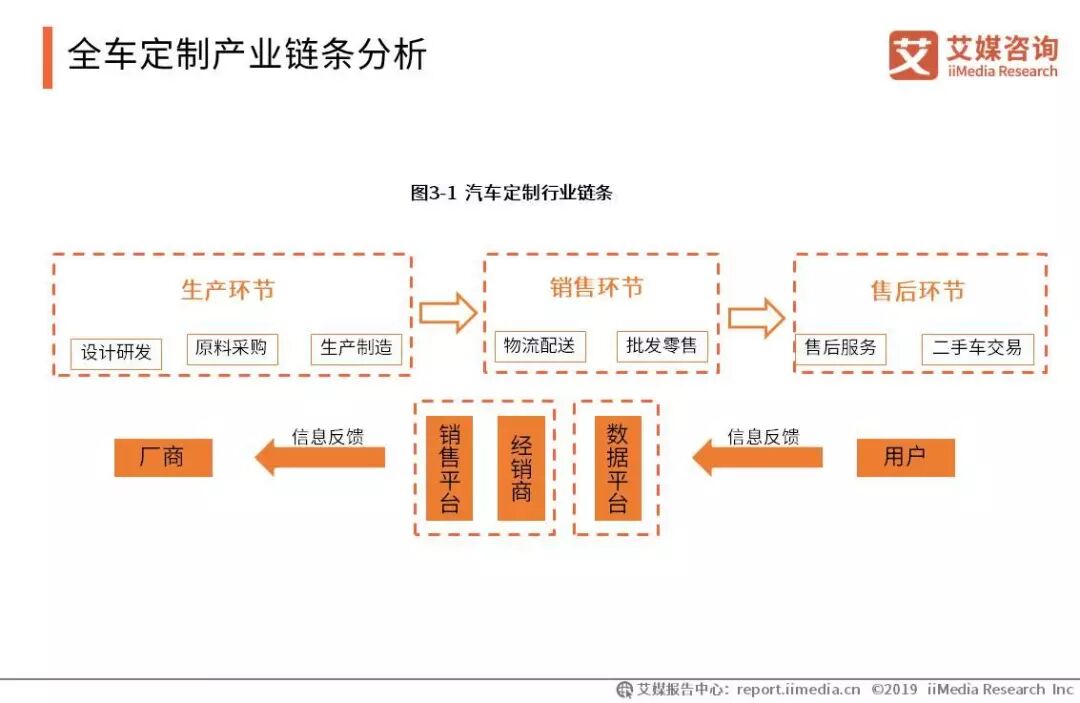 汽车定制通过互联网平台和大数据技术使汽车用户直接向厂商传达需求,形成C2B模式或C2M模式,令消费者与厂商联系更为紧密。艾媒咨询分析师认为,这种全车定制业务模式是对传统工业时代B2C模式的颠覆,虽然汽车生产的产业链条没有发生本质性的变化,但用户参与汽车的设计过程,使得用户的需求得以满足,从而实现个性化专属定制。