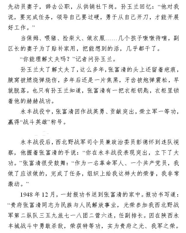1948年10月,张富清作为十四团六连班长,在永丰战役中带突击组,夜间上城,夺取了敌人碉堡两个,缴机枪两挺,打退敌人数次反扑,坚持到天明,获军一等功。