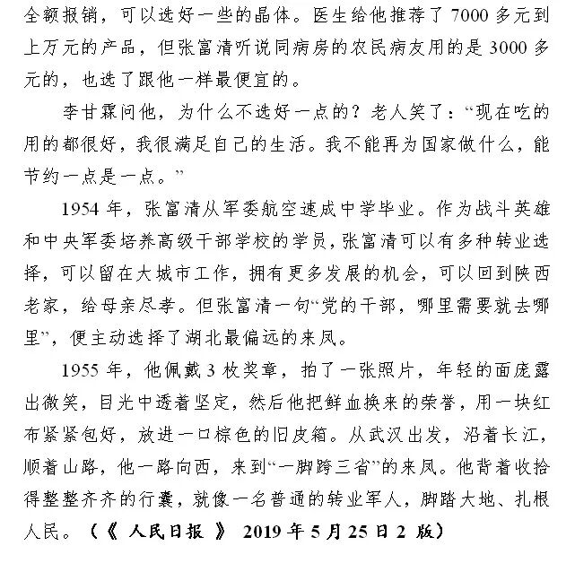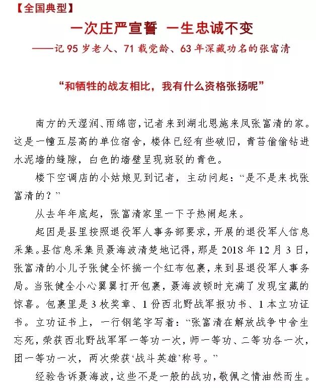 2019年7月2日,为认真学习贯彻习近平总书记重要指示精神,经中央领导同志同意,中央组织部、中央宣传部、退役军人事务部、中央军委政治工作部联合印发《关于开展向张富清同志学习的通知》。