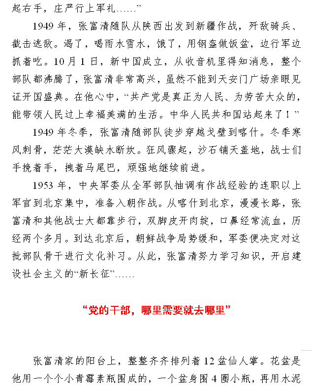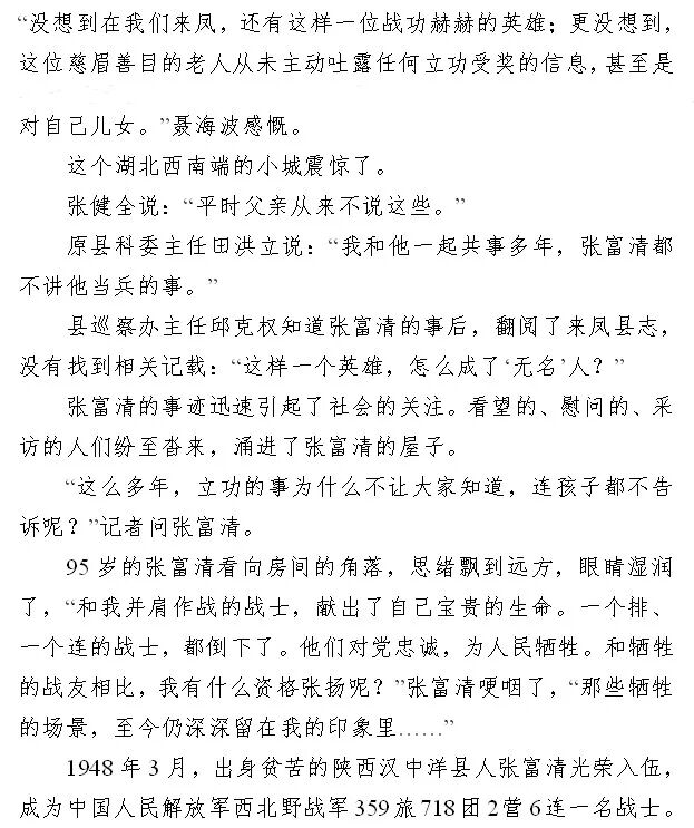 1948年3月,张富清参加中国人民解放军,在解放大西北系列战斗中英勇善战,荣立西北野战军特等功一次、军一等功一次、师一等功一次等。后转业到恩施来凤县,先后就职于城关粮油所、县粮食局、卯洞公社、县外贸局等,曾荣获“时代楷模”“全国优秀共产党员”“全国模范退役军人”等称号。