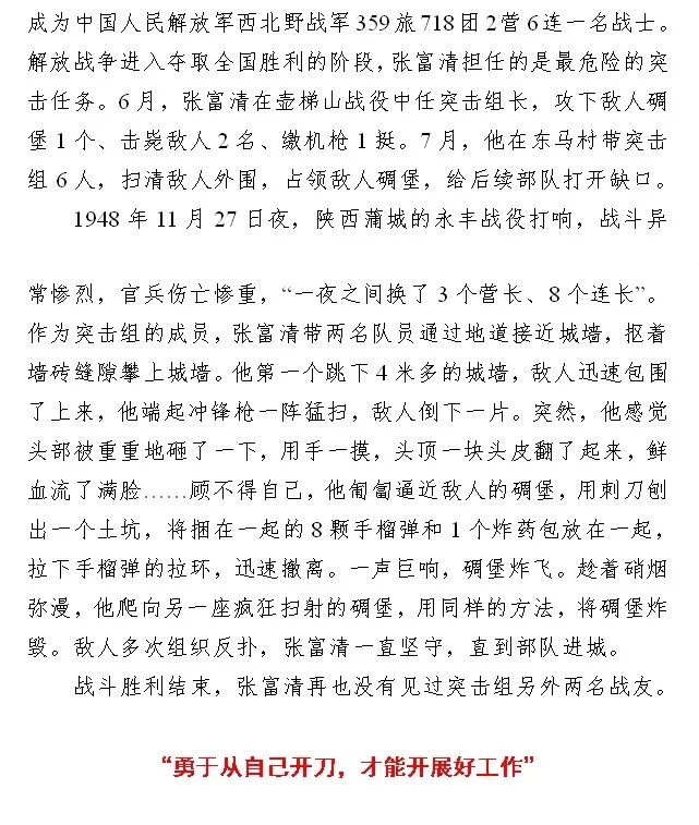 1948年7月,张富清作为十四团六连战士,带领突击组6人,在东马村消灭外围守敌,占领敌人一个碉堡,给后续部队打开缺口,自己负伤不下火线,继续战斗,获团一等功;