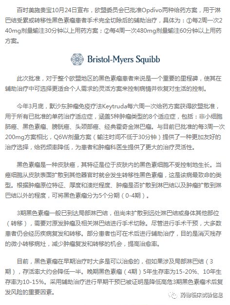 O药新适应症获欧盟批准:用于黑色素瘤辅助治疗