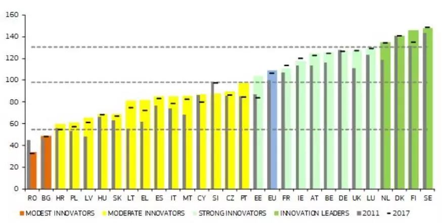 根据分数,欧盟国家分为四个群体:创新领导者,强大的创新者、温和创新者和适度创新者。瑞典是2019年欧盟创新的领先者,紧随其后的是芬兰、丹麦和荷兰。英国和卢森堡从最高级别的创新领先者地位下降到强大的创新者群体,爱沙尼亚首次加入强大的创新者群体。