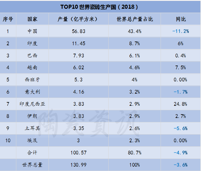 01 2018年全球瓷砖产量131亿平方米,下滑3.6%