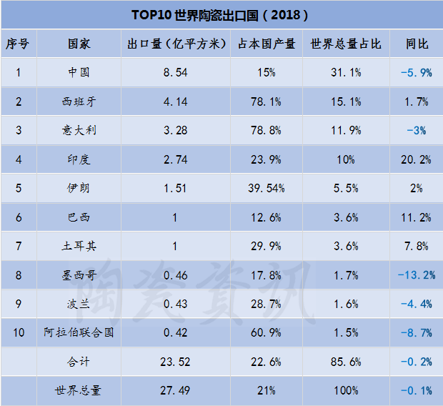 2018年,中国、西班牙和意大利这三个最大的出口国占全球瓷砖出口的58%,而排名前十的国家占总出口额的85.6%。
