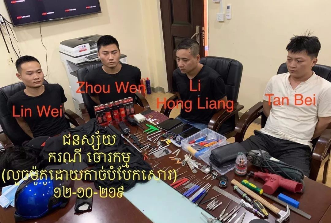 巡逻警方在巡逻时发现2名中国人正在盗窃摩托车,随后,当场录制了这2名嫌疑人的犯罪证据,将他们押送到警察局进行审讯。经调查警方还查获了一批盗窃摩托车的工具。根据这2名中国人的供词,警方先随后又逮捕涉案的另2名中国人。这4名嫌疑人分别是:Zhou Wen,25岁,无正当职业,住在西哈努克省西哈努克市第4分区第4村,没有护照;Tan Bei,29岁,无正当职业,住在西哈努克省西哈努克市第2分区第2村,没有护照;