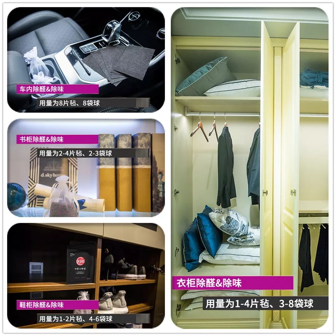 1盒一共8片甲醛分解毡,使用时间至少12个月,长效除醛不反弹。800g除醛净味变色球,3-6个月快速除醛除味,让您用最短是时间搬入新家。1盒适用于10-20平米空间,双管齐下、不用暴晒、不用频繁更换。