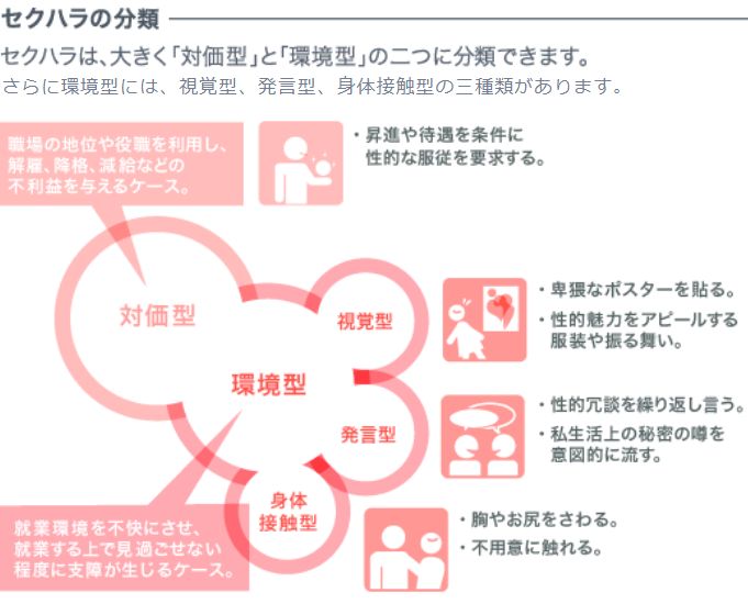 日本厚生劳动省认为,职场上的性骚扰主要分为与环境型两种。