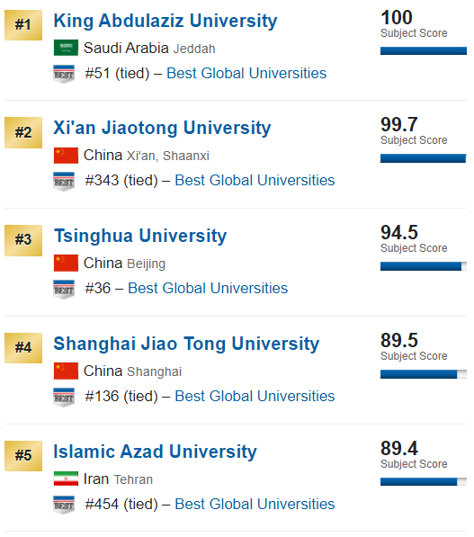 而工程类专业,中国大学的表现抢眼,前五的榜单之中均有三所院校进驻。其中哈工大高居电气和电子工程学科榜首,清华名列土木工程第一,西安交通大学排名机械工程第二。
