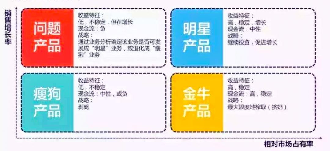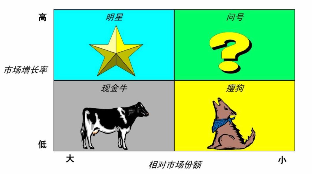 用“相对市场份额”作横轴,“市场增长率”作纵轴,画了一个“二维四象限矩阵图”,把公司的业务组合,分为现金牛业务、明星业务、问题业务,和瘦狗业务。
