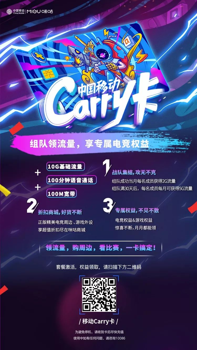 除此之外中国移动还推出Carrycard卡助力全民电竞只要办理Carrycard还将享受无障碍畅玩快游戏快来组建你的电竞战队秀出你的精彩操作