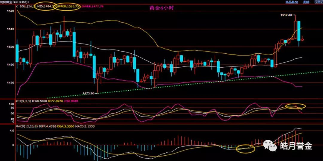 黄金4小时来看:冲高回落,MACD金叉红色动能柱开始缩量,KDJ超买后高位形成死叉,随机指标开始向下发散,指示黄金短线将展开回撤。目前10日均线1500已结转化为支撑位所在,20日均线在1496附近,金价短线也可能会该位置进行回踩确认,黄金若守该支撑并有望回布林线中轨1494附近,则短线削弱看涨信号。操作上皓月誉金建议高空为主;