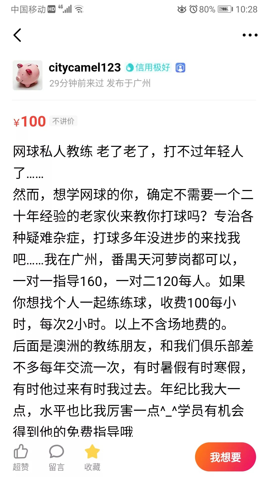 简介:南校区有一起学网球的吗?在闲鱼上看到一个不错的教练,想报名一对二但缺个小伙伴,一对二一人小时120,有意愿的可以联系我哦,微信h1930520447