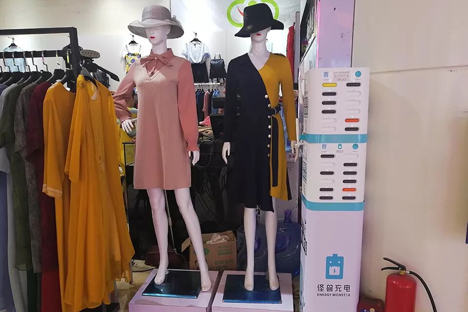 ▲ 广州花城汇购物中心,一台24个机位的“怪兽”共享充电宝柜机摆在女装店的模特旁,1/3的卡槽是空的。(南方周末记者 敬奕步/图)4