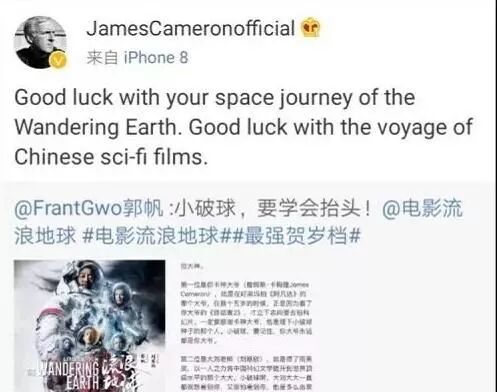 好莱坞著名导演卡梅隆还专门发文祝贺,称:祝你在漫游地球的太空之旅中好运,祝中国科幻电影之旅顺利。目前,《流浪地球》已经登陆北美院线,冲过国门。