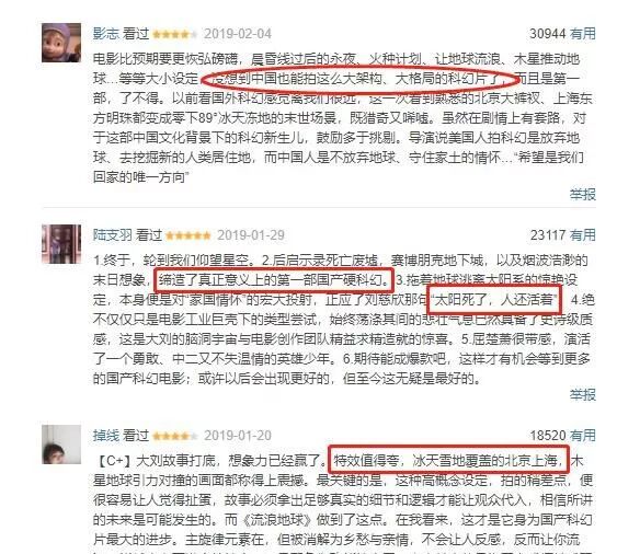 因为口碑,导致后续排片票房上升的电影并不止《流浪地球》,但作为国内的科幻片达到如此票房的,《流浪地球》却是第一部电影。目前,《流浪地球》受到了观众好评,曾经印象中科幻片的五毛特效终于成为过去,国人为中国能够缔造了真正意义上的第一部国产硬科幻而欣喜。