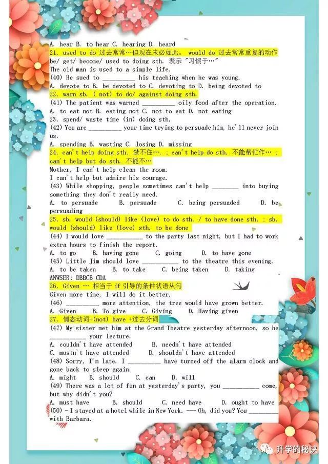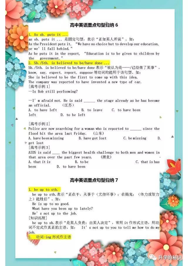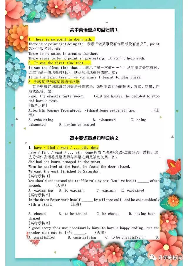 鉴于此,老师今天就把高中英语的重点句型进行了归纳整理!希望同学们都能收藏起来,因为这些句型都是在英语考试当中必考的,相信只要吃透掌握,对于英语成绩的提升是非常有帮助的。