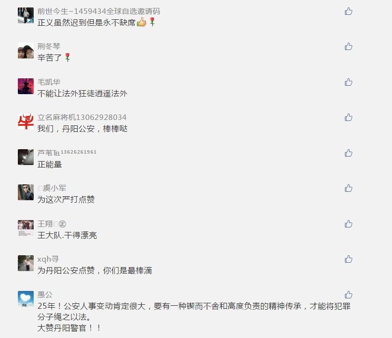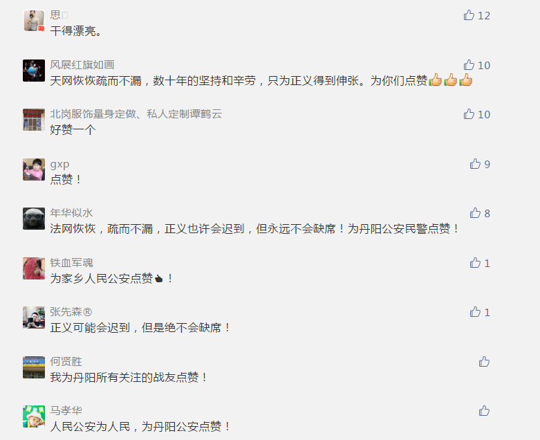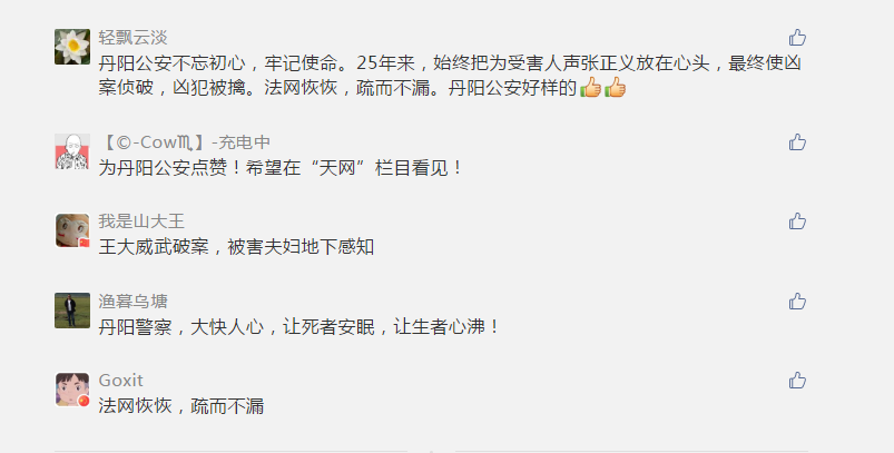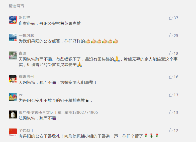 10月25日,“丹阳公安”微警务推送文章《25年前抢劫杀人命案积案告破 |丹阳公安,你真棒!》,报道了镇江、丹阳公安民警坚持不懈,抽茧剥丝,一桩25年前的抢劫杀人命案告破,将三名犯罪嫌疑人绳之以法的新闻,我市近5万余名网民点击阅读,留言500余条。