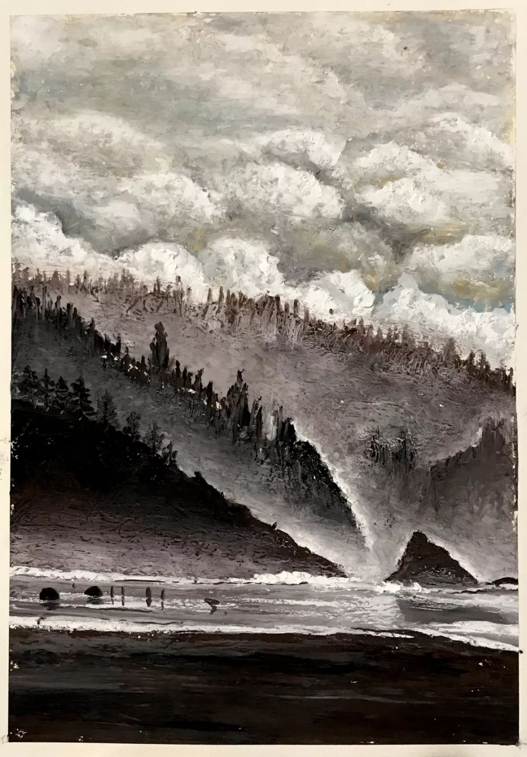 今日鸡森老师的这幅雾中山丘,第一眼看上去会给人一种阴凉的感觉,不自觉的要打一个冷颤。但静下心来,再去细细的感受,画中那股仙气会慢慢的将你带入其中,仿佛可以感受到那雾水落在脸颊,远处的山中,传来阵阵鸟鸣...